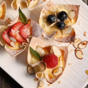 - Preheat the oven to 350°F. Spray 20 mini muffin cups with nonstick cooking spray and set aside. Press a won ton wrapper into each muffin cup, letting it extend over the sides. In a medium bowl whisk together the cream cheese, egg, sugar, yogurt, flour, and almond extract until smooth and creamy.