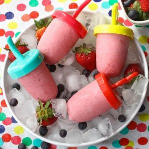 This recipe is flexible: You can use frozen strawberries if you don’t have fresh on hand; use peaches instead of berries; or add a handful of blueberries to the blender mix. As for the yogurt, I call for strawberry, but vanilla would work well too! My pops are easy to make, and each one provides 12% of a toddler’s daily requirement for calcium.