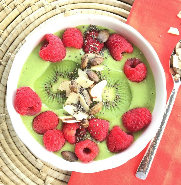 Get your kids excited about this recipe by having them add the ingredients to a blender. Or set out an assortment of toppings — coconut chips, raspberries, chia seeds, kiwi slices, and banana slices — and have the kids decorate their green smoothie bowls with whatever whets their appetite.