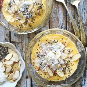 - Meanwhile, for the topping, place the almonds, 1 tablespoon coconut, and chia seeds in a small bowl and stir to combine.