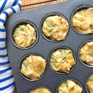 Chicken pot pie, with its butter-laden crust on top, has a reputation for being rich and delicious and super high in fat. For the fix, I use egg roll wrappers as the ‘crust,’ and the results are playful and fun and a lot lighter. And not too fussy either.