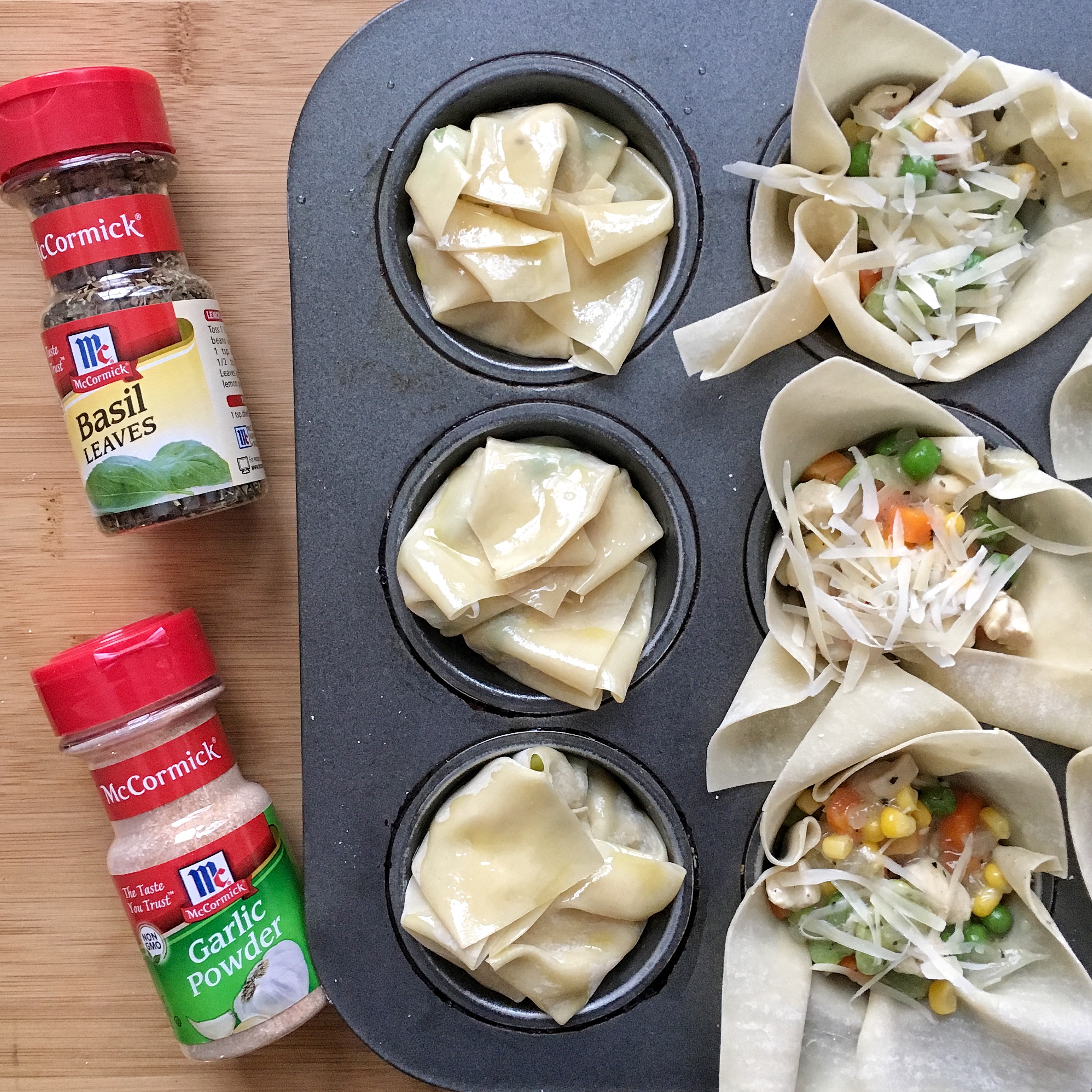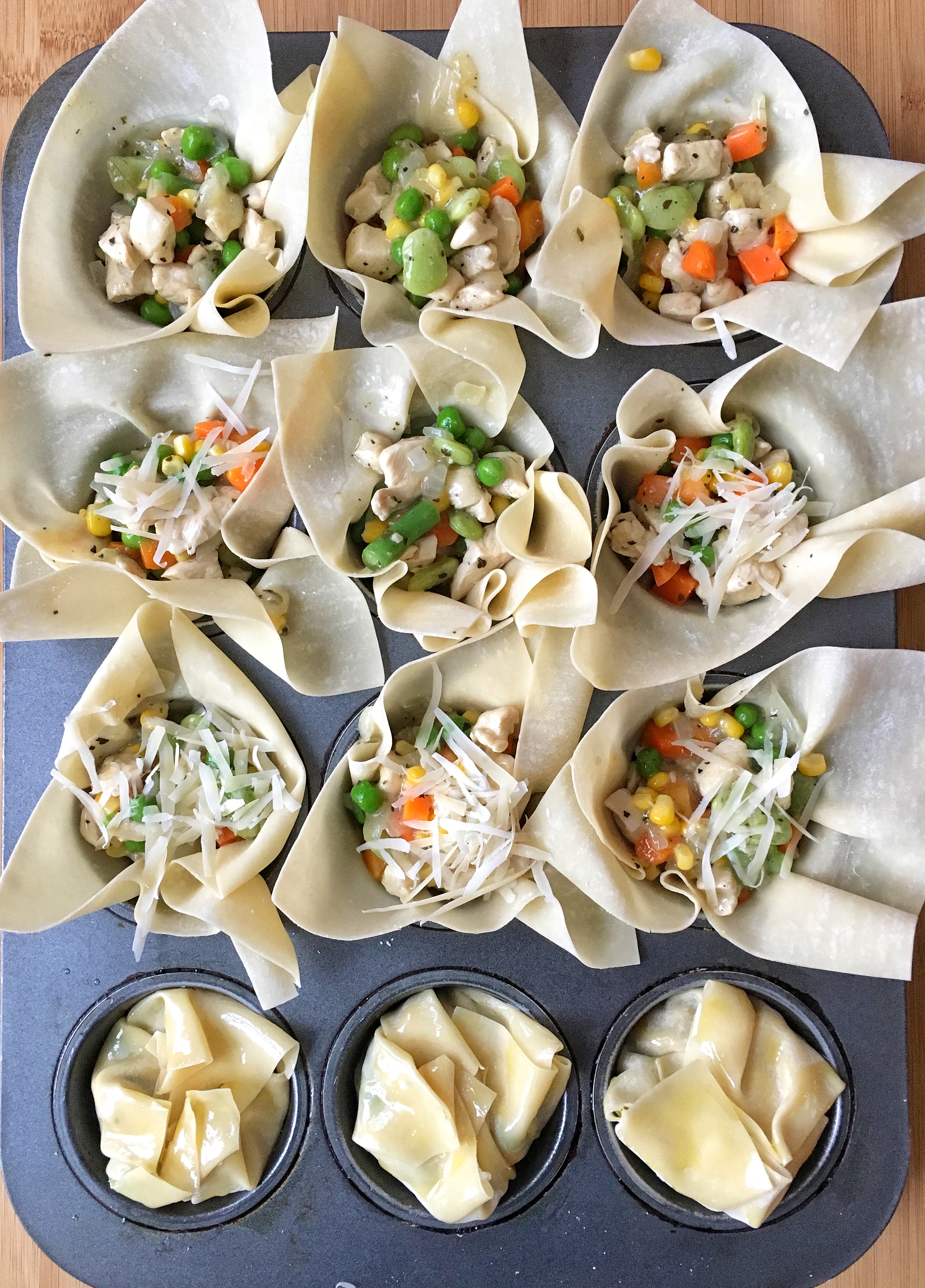 - To prepare the bundles, use a muffin pan with 12 medium-size cups (do not coat with nonstick cooking spray). Gently place 1 egg roll wrap into each cup, letting it extend over the sides.