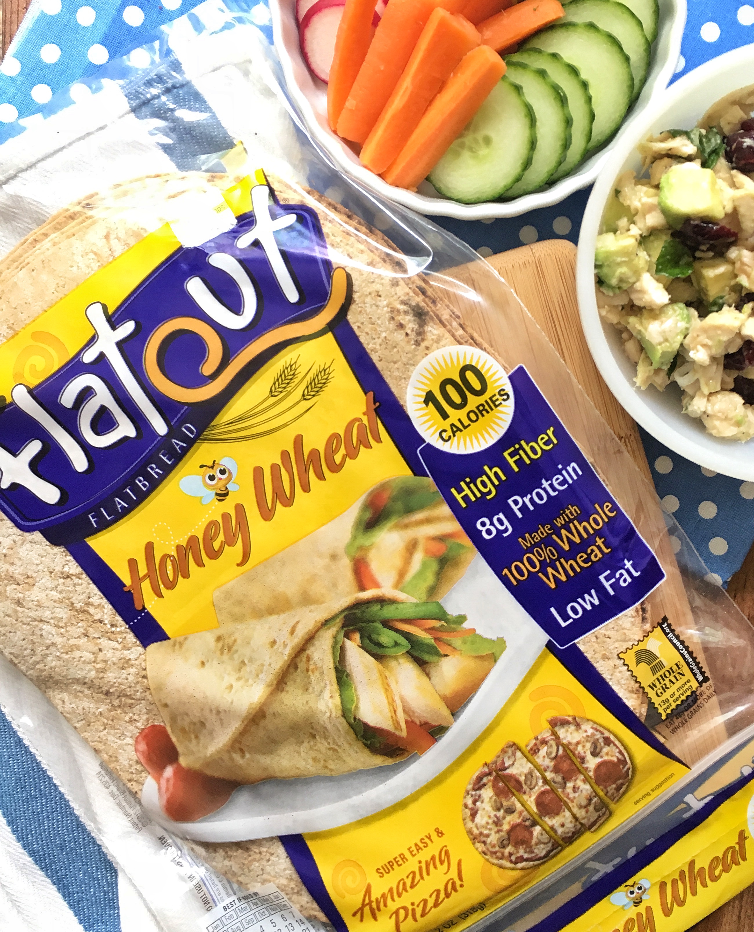 For the base, I used Honey Wheat Flatout Flatbread wraps. Each wrap has just 100 calories, 0 grams of saturated fat, and a very impressive 7 grams of fiber. (Most adults and kids don’t consume the recommended 19 to 38 grams of fiber each day, so the 7 grams from the flatbread was much appreciated!) The wraps are soft and easy to roll. Whether portion control is a priority for you and your family or you’re cooking up breakfast, lunch, or dinner, Flatout Flatbeads are a simple, fast, and nutritious solution.