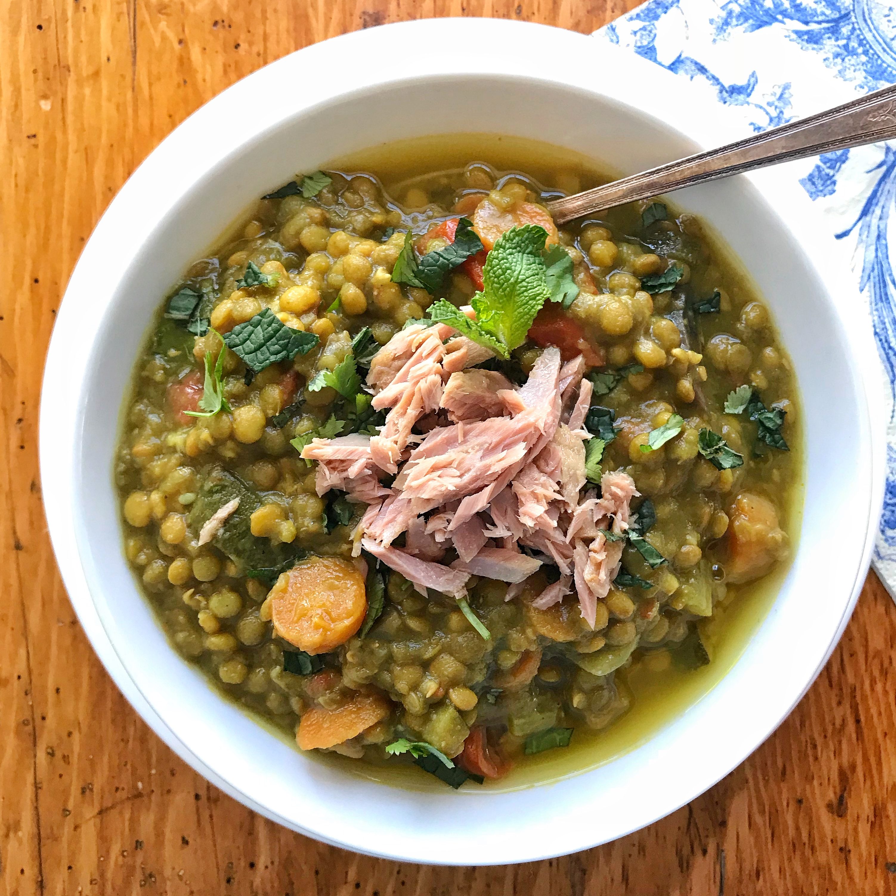 This recipe was inspired by my recent interview with Melissa Clark, author of Dinner in an Instant. She has a red lentil soup recipe in the book that I adapted to include what I had on hand in my fridge and pantry including green lentils, carrots, onion, zucchini, tomatoes, and celery, fresh herbs, and boneless, skinless sardines.