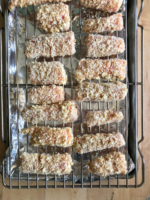 Line a rimmed baking sheet with aluminum foil. Spray a cooling rack with nonstick cooking spray and place on top of the baking sheet. Place the salmon sticks on top and then spray their tops lightly with nonstick spray. Bake at 425°F for 8 to 10 minutes until the coating is crispy and the fish is cooked through.