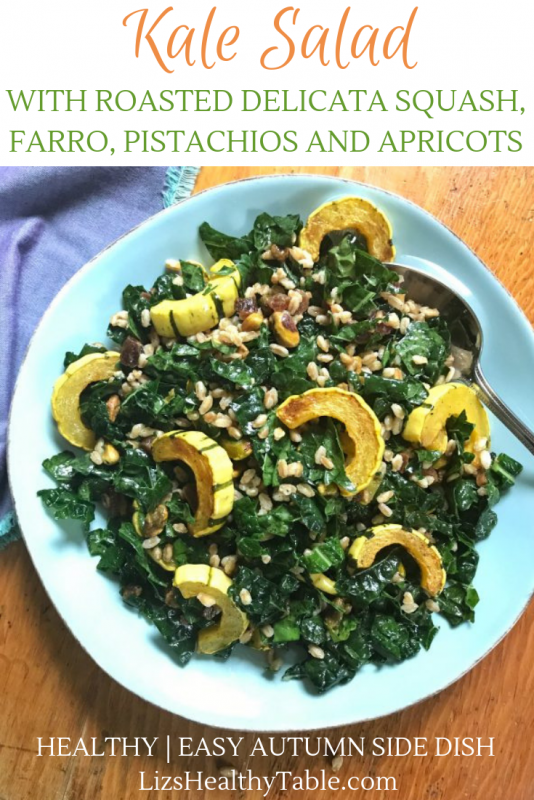 Kale salad with roasted delicata squash, farro, pistachios, and apricots via LizsHealthyTable.com