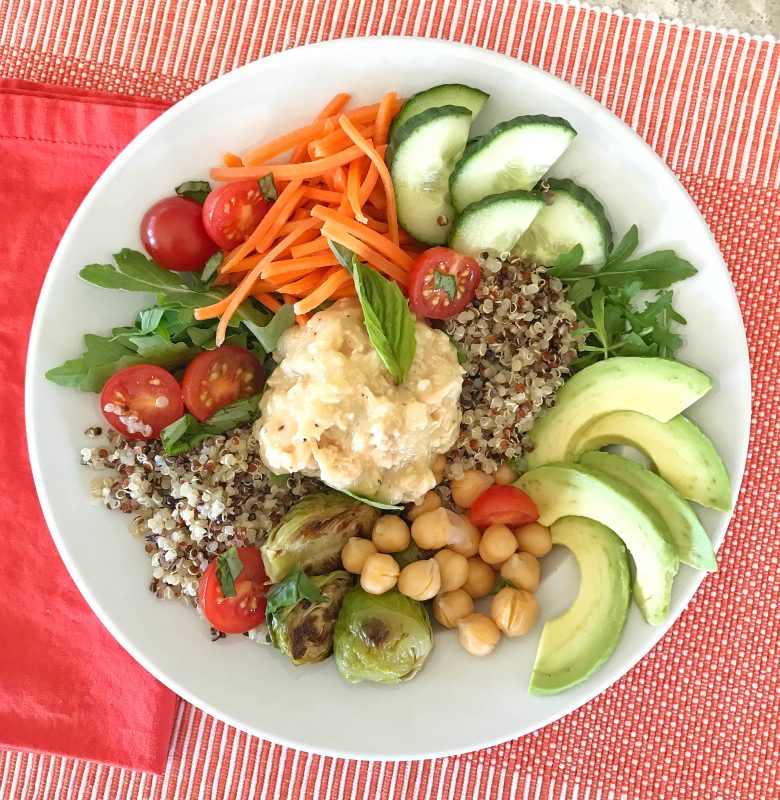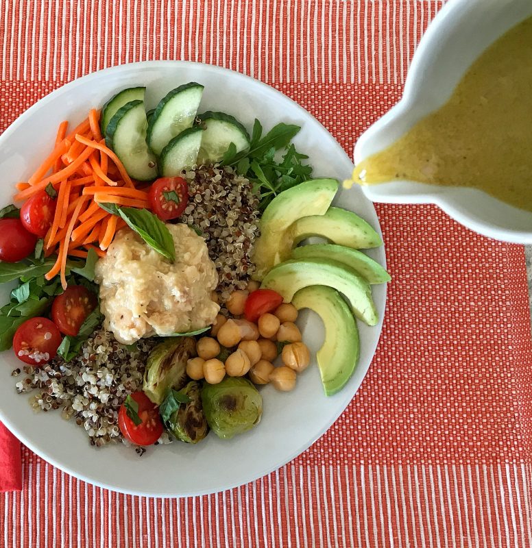 The vegetables I set out for these build-your-own Buddha bowls were arugula, thinly sliced English cucumbers, halved tomatoes mixed with olive oil and fresh basil, roasted Brussels sprouts, shredded carrots, and chickpeas. For my whole grain, I cooked up a cup of quinoa, and I also set out slices of luscious avocado. My salad dressing was whipped up quickly with extra virgin olive oil, lemon juice, chopped shallot, Dijon mustard, maple syrup, and kosher salt and pepper. To make this meal even easier, use your favorite bottled salad dressing.