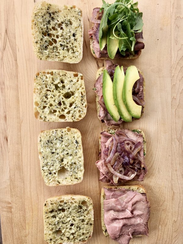That was then … and this is now. This new recipe was inspired by the roast beef sandwich of my youth, but I gave it a modern twist by replacing the Russian dressing with a luscious combo of mayo and basil pesto, swapping the rye bread for toothsome ciabatta rolls, and switching out the coleslaw with caramelized red onion, avocado, arugula, and fresh mint leaves. All those textures and flavors paired just perfectly with the sliced roast beef, purchased conveniently at my local supermarket deli counter.