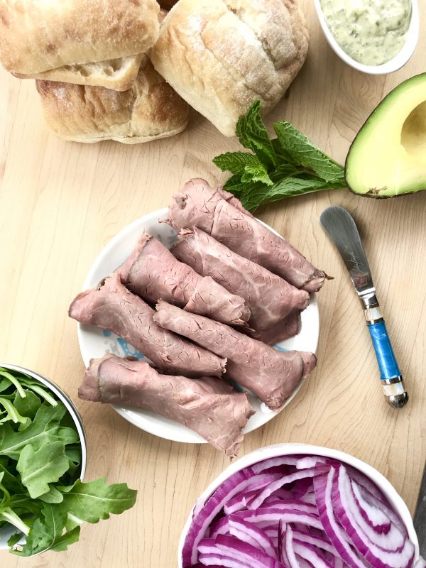 Layering is the name of the game here. Spread the pesto mayo sauce on both sides of the sliced ciabatta rolls. Layer with the torn mint, roast beef (I use 2 ounces per sandwich), caramelized onion, avocado, and arugula. Voila. Done!