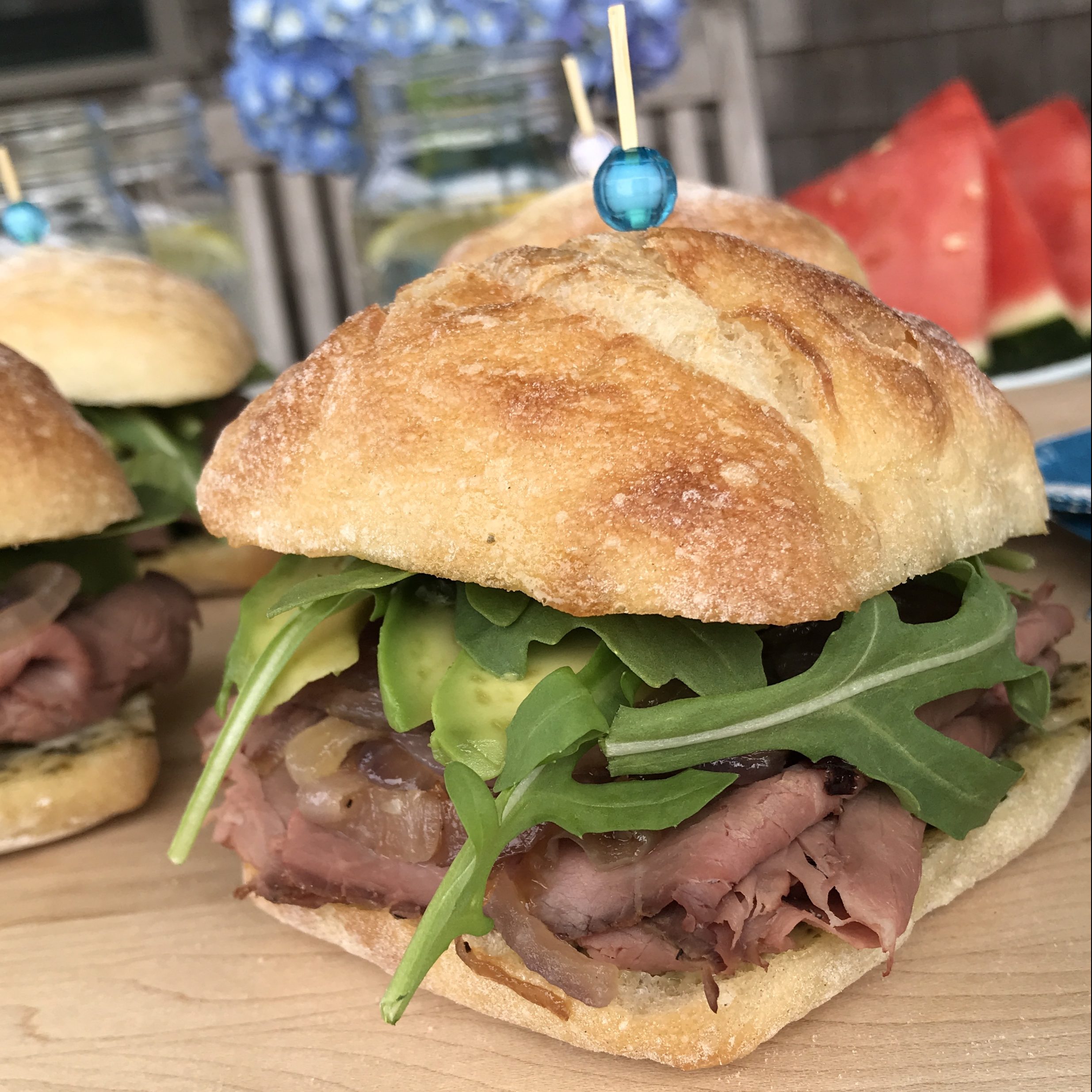 - Place the ciabatta halves on a work surface. Top the bottom half of each roll evenly with the mint leaves, roast beef, caramelized onion, avocado, and arugula. Close each sandwich, secure with a toothpick and serve. Or wrap and bring to a picnic or pack in a lunchbox.