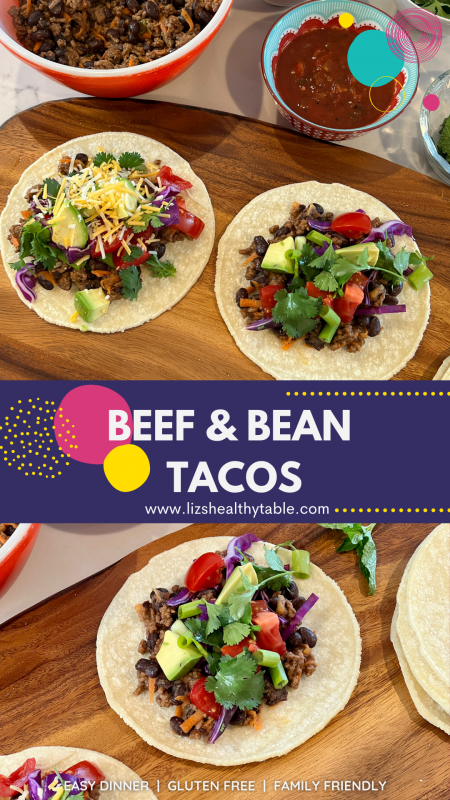 This recipe for Beef & Bean Tacos is a riff on the Have-It-Your Way Tacos recipe from my first cookbook, The Moms’ Guide to Meal Makeovers. It’s an oldie but goodie and one of those dinner recipes that gets a two-thumbs up from everyone at the table.