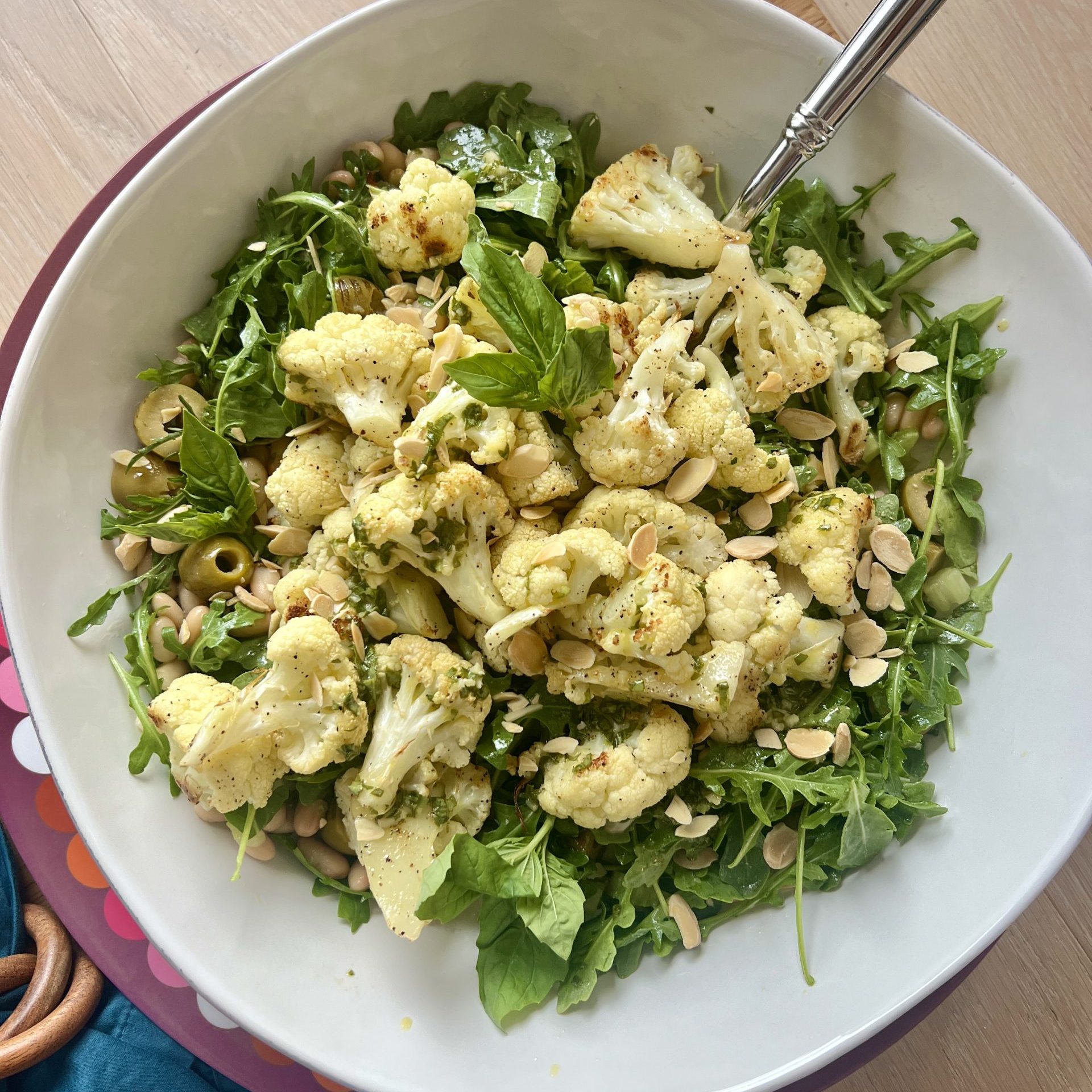- For the salad, place cauliflower florets in a large bowl. Drizzle olive oil over florets and gently toss to combine. Season with the salt and pepper. Transfer to the prepared baking sheet. Bake, turning halfway through, until golden and tender, 20 to 24 minutes.