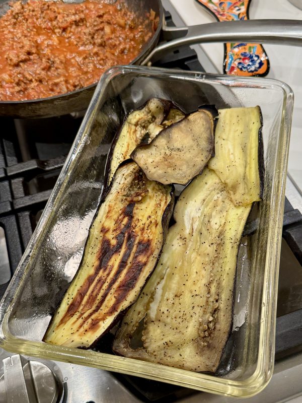- After 5 minutes remove from oven. Flip the eggplant slices and return to the oven. Rotate the baking sheet when you place it back into the oven. Cook another 4 to 5 minutes, or until the slices are softened and golden brown. Repeat with the next baking sheet. If the eggplant slices char a bit or overlap a bit when you arrange them on the baking sheets, that’s okay. They will cook fully in the casserole. Set aside.
