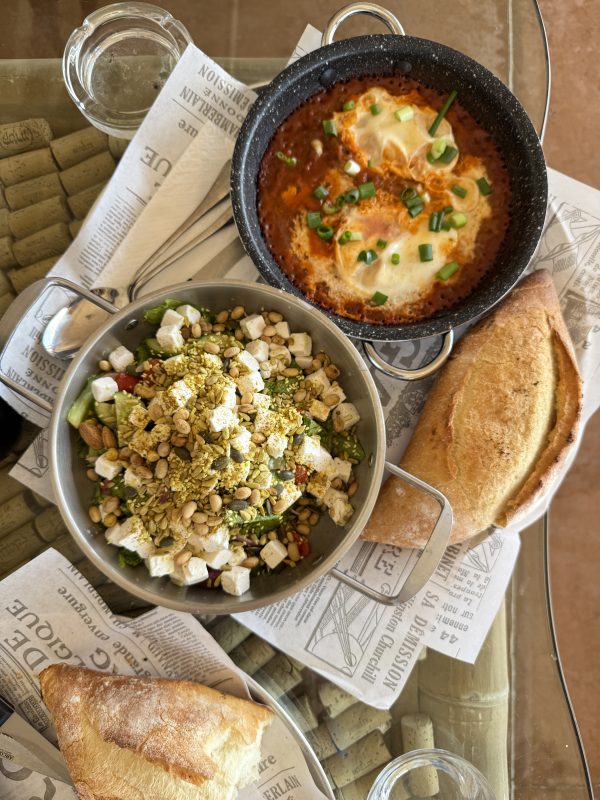This meal was one for the books. For lunch, we ordered a hearty salad with beans and nuts alongside a bubbling skillet of shakshuka. Fresh, vibrant, and pure comfort.